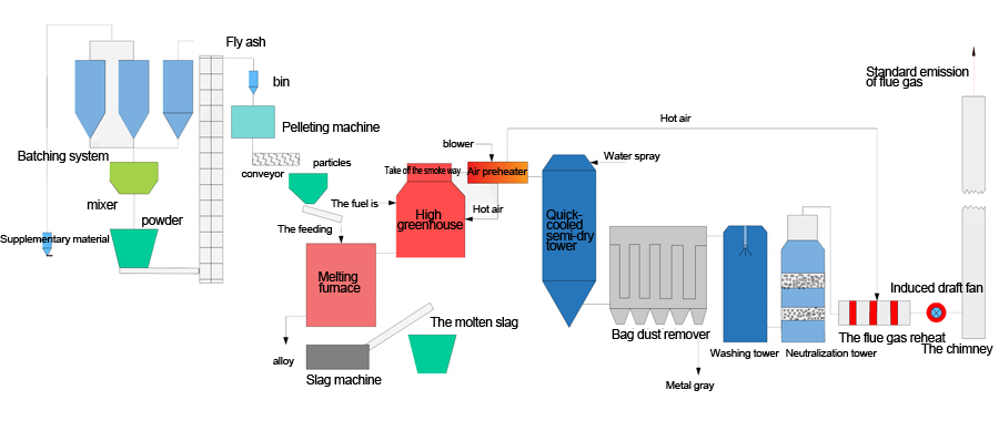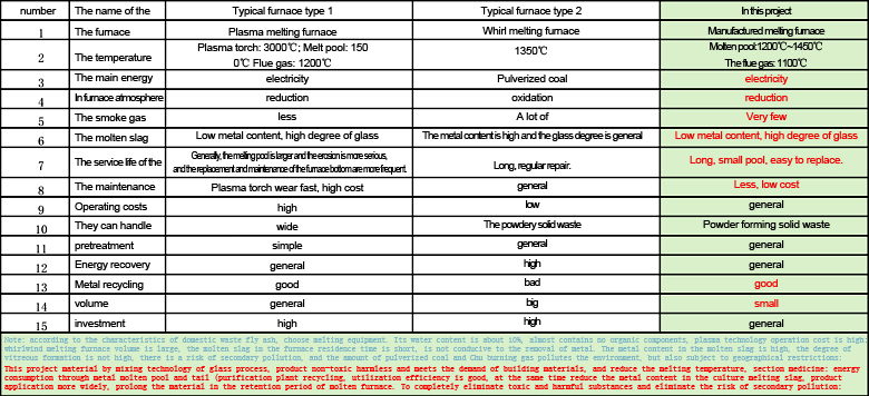 This project is mainly aimed at high-temperature melting treatment of fly ash, making it harmless, reducing, recycling and energy saving. The selected equipment and process are suitable for on-site treatment of waste production units, which covers a small area and has no transportation cost and secondary pollution risk in the transportation process. Flying ash is the waste produced by the enterprise's own domestic garbage incineration. The amount of exhaust gas generated is very small, and the existing exhaust gas treatment process does not need to be increased and adjusted. Comparison of present centralized collection of fly ash landfill disposal way and the centralized collection of fly ash melting treatment scheme is proposed, the production unit directly to the court to scrap disposal way is more suitable for hazardous waste treatment in China, the working condition of melting system stability, wide range of processing, low investment, low running cost, disposal more thoroughly, resource recovery benefit is more outstanding.
