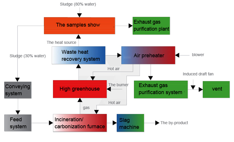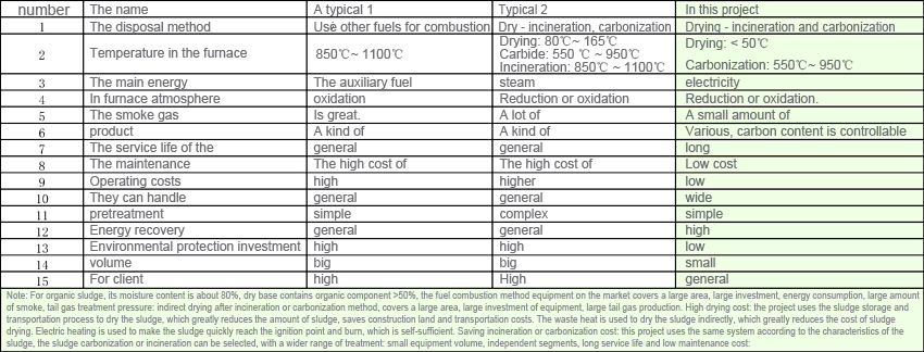 · This project is mainly aimed at incineration/carbonization of organic sludge, so as to make it harmless, reduce, recycle and save energy in production. The selected equipment and process suitable for production floor and dispose waste unit, cover an area of an area small, no storage cost and transport cost, avoid the risk of the transport process of secondary pollution, comparing the present centralized collection of sludge landfill disposal ways and centralized collection or carbide sludge incineration scheme proposed, production units directly to the court to scrap disposal way is more suitable for treatment of solid waste in our country, The new integrated sludge dry-incineration/carbonization system features stable operating conditions, wide treatment range, low investment, low operating cost, more thorough treatment and disposal, and more outstanding recycling benefits