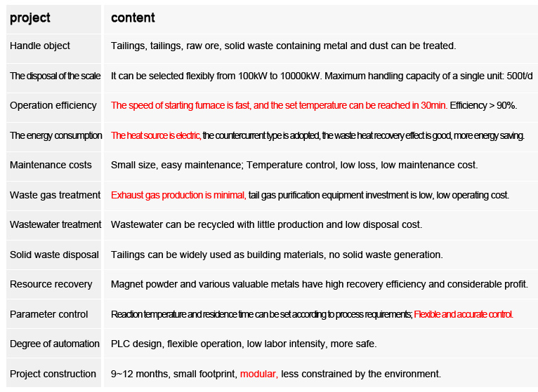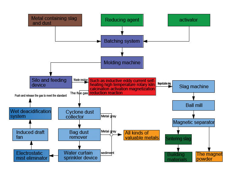 Will tail slag, tailings, undressed ore and metal containing slag and dust, by adding activator and reducing agent such as ingredients, into the inductance vortex self-heating type high temperature rotary kiln, the kiln preheating dry, heating calcining, activation, reduction, magnetization and a series of physical and chemical reaction, the magnetization slag after heat exchange cooling from a preheater, After grinding and magnetic separation, the metal and sintering slag are separated and collected respectively. All kinds of valuable metals in the exhaust gas are collected by means of pulse dust collector and water curtain washing. Recycling of metal and recycling of sintering slag as building materials.