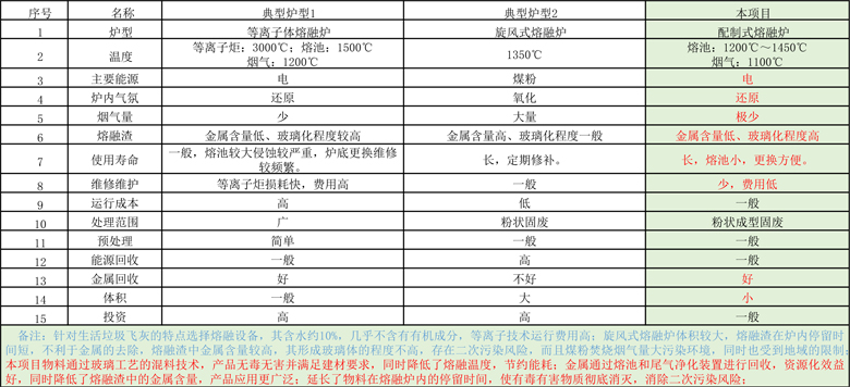 本項目主要針對飛灰高溫熔融處理,使其達到無害化、減量化、資源化、節(jié)能化。所選設(shè)備和工藝適合產(chǎn)廢單位場內(nèi)自行處理,占地面積小,無運輸費用和運輸過程二次污染風(fēng)險,飛灰即該企業(yè)自身生活垃圾焚燒產(chǎn)生的廢物,產(chǎn)生廢氣量極小,現(xiàn)有尾氣處理工藝無需增加和調(diào)整,對比現(xiàn)階段集中收集飛灰填埋的處置方式和集中收集飛灰熔融處理的方案提議,產(chǎn)廢單位直接場內(nèi)自行處置的方式更適合我國危險廢物的處理,熔融系統(tǒng)工況穩(wěn)定、處理范圍廣、投資低、運行成本低、處理處置更徹底、資源化回收效益更突出。