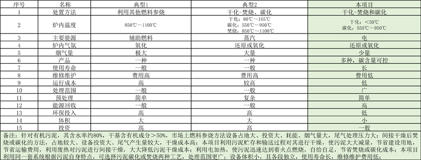 · 本項目主要針對有機污泥焚燒/碳化處理,使其達到無害化、減量化、資源化、生產(chǎn)節(jié)能化。所選設(shè)備和工藝適合產(chǎn)廢單位場內(nèi)自行處理,占地面積小,無貯存費用和運輸費用,避免了運輸過程二次污染的風險,對比現(xiàn)階段集中收集污泥填埋的處置方式和集中收集污泥碳化或焚燒處理的方案提議,產(chǎn)廢單位直接場內(nèi)自行處置的方式更適合我國固廢的處理,新型一體式污泥干燥-焚燒/碳化系統(tǒng)工況穩(wěn)定、處理范圍廣、投資低、運行成本低、處理處置更徹底、資源化回收效益更突出。
