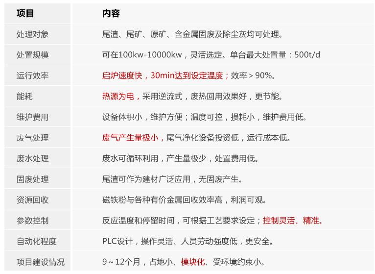 將尾渣、尾礦、原礦及含金屬廢渣及除塵灰,通過添加活化劑和還原劑等配料后,送入電感渦流自熱式高溫旋轉(zhuǎn)窯內(nèi),在窯內(nèi)進(jìn)行預(yù)熱干燥、加熱煅燒、活化、還原、磁化等一系列物理化學(xué)反應(yīng),磁化渣經(jīng)換熱冷卻后從窯尾排出,再經(jīng)過磨粉、磁選將金屬與燒結(jié)渣分離后分別收集。廢氣中的各種有價(jià)金屬,通過脈沖除塵器、水幕洗滌的方式收集。金屬回收、燒結(jié)渣作為建筑材料的資源化過程。