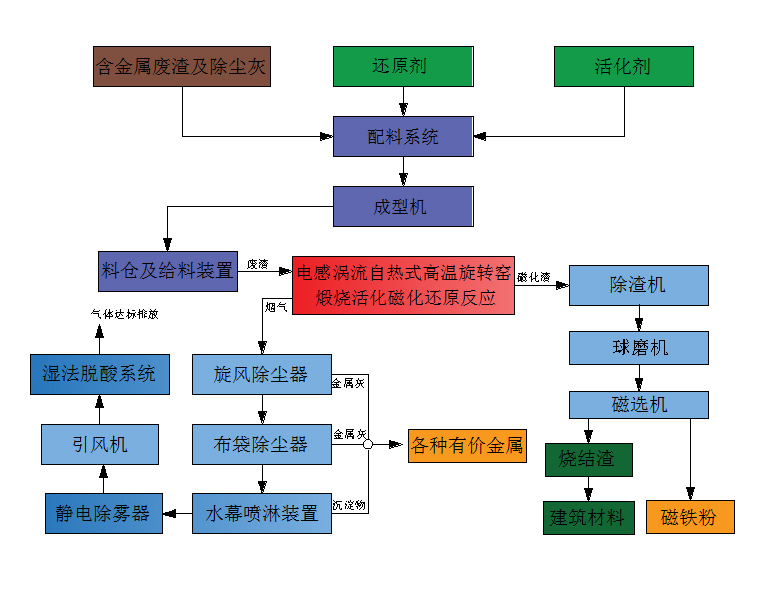 將尾渣、尾礦、原礦及含金屬?gòu)U渣及除塵灰,通過(guò)添加活化劑和還原劑等配料后,送入電感渦流自熱式高溫旋轉(zhuǎn)窯內(nèi),在窯內(nèi)進(jìn)行預(yù)熱干燥、加熱煅燒、活化、還原、磁化等一系列物理化學(xué)反應(yīng),磁化渣經(jīng)換熱冷卻后從窯尾排出,再經(jīng)過(guò)磨粉、磁選將金屬與燒結(jié)渣分離后分別收集。廢氣中的各種有價(jià)金屬,通過(guò)脈沖除塵器、水幕洗滌的方式收集。金屬回收、燒結(jié)渣作為建筑材料的資源化過(guò)程。